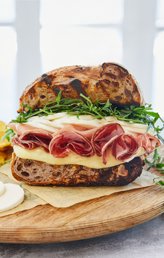 Perfectly built for bold sandwiches like Pan de la Sierra, the cold fermentation of this rustic cranberry-walnut bread will give you a boost of delicious flavor that marries well with the savory prosciutto and Coppa and the creaminess of the Mozzarella and Brie.