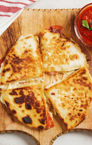 - Mound shredded Mozzarella over sauce, followed with the grated Parmesan, keeping the edges of the tortilla clean. Top the cheese with the pepperoni slices. Cover with the second tortilla, pressing it down gently.