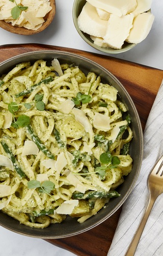 Meanwhile, in a separate pot on low heat, add cream, pesto, Bel Paese, and ¼ cup of the Parmesan cheese. Stir until cheese is melted. Add ½ teaspoon of black pepper.