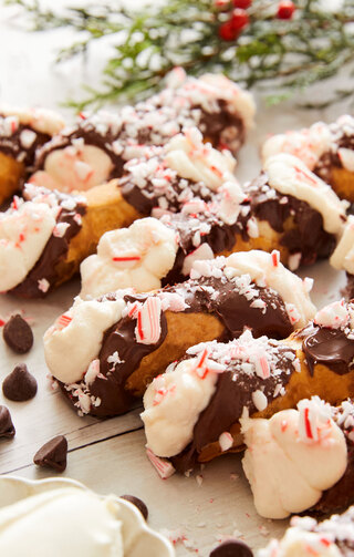Dip the ends of the filled cannoli into the crushed peppermint to create a festive, colorful edge.