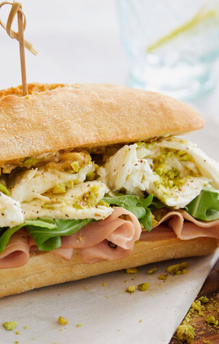 2. Spread a generous layer of pistachio crema on both sides of the toasted ciabatta.