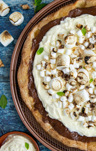 Place a mix of small and large marshmallows on top. Gently toast marshmallows in a wood fired oven or under the broiler. Garnish with mint leaves and chocolate hazelnut cigarette cookie crumbs if desired. Serve immediately.