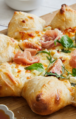 After removing pizza from the oven, lay slices of prosciutto over the cheese and arrange fig slices on top.