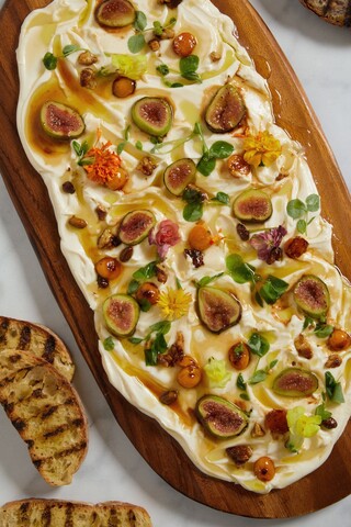 - Garnish the board with micro basil, edible flowers and a drizzle of your favorite honey. Serve the board with grilled bread slices for dipping.