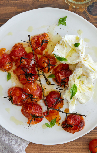 Arrange Ovoline on a platter. With hands, tear into large pieces. Spoon warm tomato mixture with juices over the platter and Ovoline. Sprinkle with sea salt.