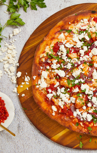 Remove from the oven and scatter shrimp evenly over each pizza, followed with crumbled Feta. Cook another 3–5 minutes until done.