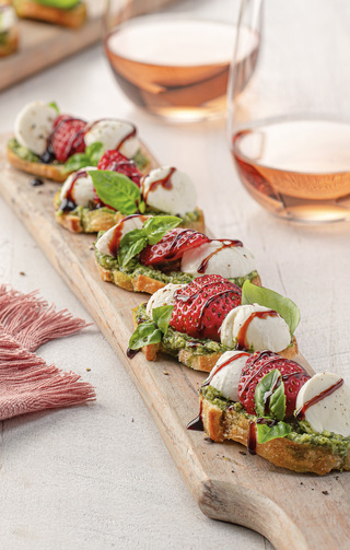 Spread a small amount of pesto on each slice. Arrange strawberries, Bocconcini, and basil on top of each.