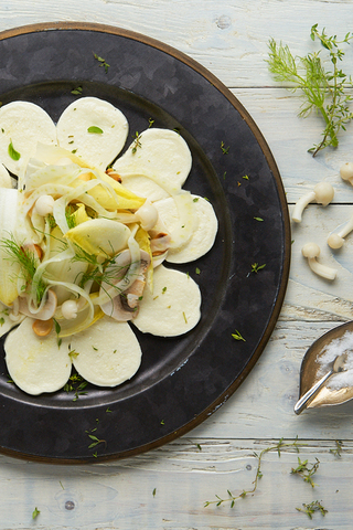 3. In a large bowl, gently toss the fennel, endive, and sliced white mushrooms with the vinaigrette until evenly coated.