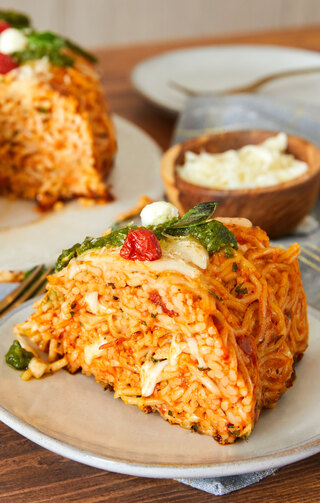 Carefully invert the pan onto a serving platter to release the frittata. Drizzle the frittata with pesto, and top with the roasted tomatoes. Garnish with Perles and basil, if desired. Slice and serve warm or at room temperature.