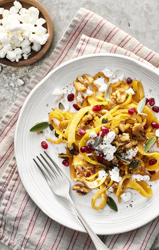 - Toss the butter sauce with the squash spirals and pomegranate seeds and mix well. Adjust seasoning with salt and pepper. Garnish with Goat Cheese crumbles and torn fresh sage leaves.