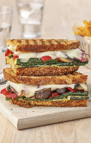 To assemble sandwiches, start with a layer of pesto mayo, top with grilled vegetables, and place a slice of Mozzarella on top.